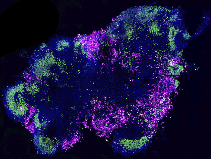 Brain organoid infected with SARS-CoV-2. Cell nucleus in blue,